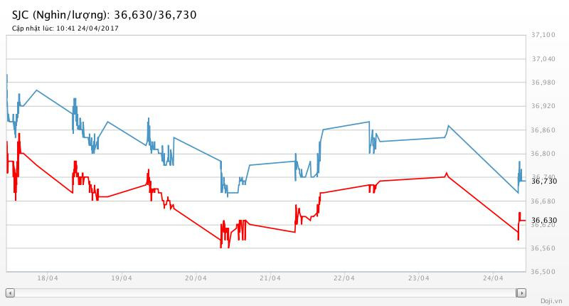 Tại các đại lý của Doji, giá vàng miếng SJC đã được tập đoàn này điều chỉnh giảm mạnh 110 nghìn đồng chiều mua và 130 nghìn đồng chiều bán về yết ở 36,63 – 36,73 triệu đồng/lượng (MV-BR) đối với giao dịch lẻ; và đắt hơn 10 nghìn đồng chiều mua, đồng thời rẻ hơn 10 nghìn đồng chiều bán đối với giao dịch buôn ở thị trường Hà Nội. Như vậy, doãng chênh lệch 2 chiều mua - bán ở Doji hiện là 100 nghìn đồng/lượng.
