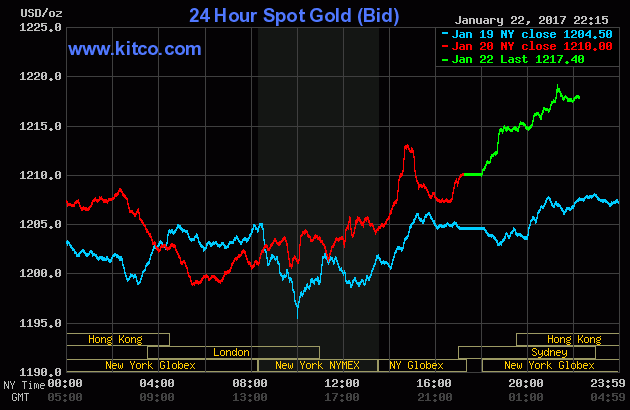 Chốt phiên giao dịch cuối tuần trước (Thứ Sáu ngày 20/1/2017), giá vàng giao tháng Hai trên sàn Comex tại Sở Giao dịch New York Mercantile bật $3,40 (+0,3%) - tương đương 0,3% - lên chốt tại $1.204,90/oz. Tính chung cả tuần, giá vàng đã tăng khoảng 0,7% - căn cứ theo dữ liệu của FactSet.