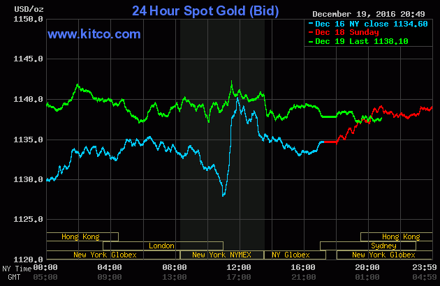 Chốt phiên giao dịch đầu tuần (Thứ Hai ngày 19/12), giá vàng giao Tháng Hai trên sàn Comex tại Sở giao dịch New York Mercantile đảo chiều nhích nhẹ $5,30 (+0,5%) lên đóng cửa ở $1.142,70/oz. Tuần trước, vàng đã trượt giá tổng cộng 1,8% và có thời điểm còn rơi xuống mức $1.129,80/oz – khoét đáy kể từ đầu Tháng Hai.