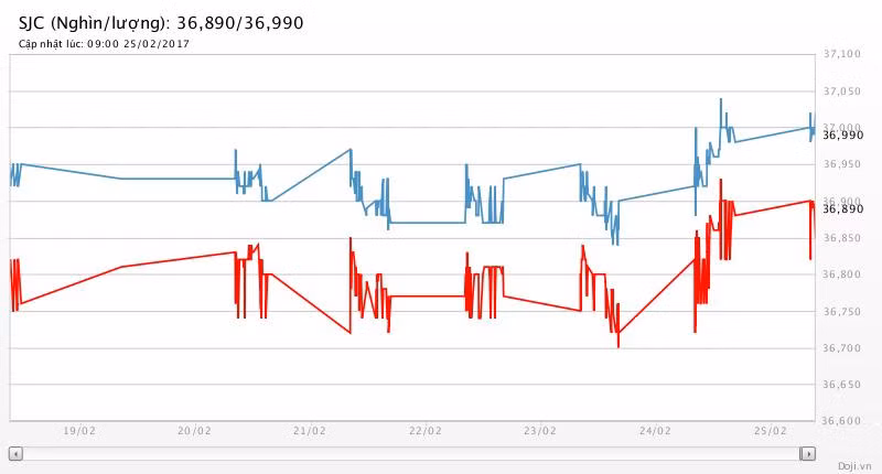 Trong khi, tại các đại lý của Doji, giá vàng miếng SJC chỉ được tập đoàn này điều chỉnh tăng nhẹ 10 nghìn đồng mỗi chiều lên yết ở 36,89 – 36,99 triệu đồng/lượng (MV-BR) đối với giao dịch lẻ; và đắt hơn 10 nghìn đồng chiều mua, đồng thời rẻ hơn 10 nghìn đồng chiều bán đối với giao dịch buôn ở thị trường Hà Nội. Theo đó, doãng chênh lệch 2 chiều mua - bán ở Doji đang là 100 nghìn đồng/lượng.