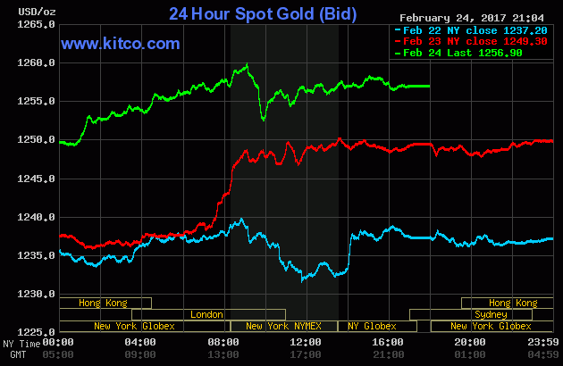 Chốt phiên giao dịch cuối tuần (Thứ Sáu ngày 24/2/2017), giá vàng giao tháng Tư trên sàn Comex tại Sở Giao dịch New York Mercantile tăng $6,90 (+0,6%) lên chốt tại $1.258,30/oz – tiếp tục bồi đỉnh kể từ ngày 10/11, căn cứ theo dữ liệu của FactSet. Tính chung cả tuần, giá vàng đã tăng 1,6%, đánh dấu tuần thăng hoa thứ 4 liên tiếp.