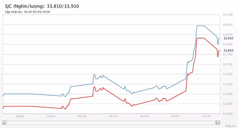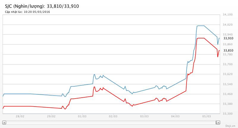 Với biểu giá trên, tính ra giá vàng SJC Việt Nam hiện đang cao hơn giá vàng thế giới khoảng 40 nghìn đồng mỗi lượng. Trước đó, trong hôm qua 4/3, lần đầu tiên sau hơn 5 năm, giá vàng thế giới mới lại thấp hơn giá quốc tế, với khoảng cách khoảng 220 nghìn đồng mỗi lượng (chưa tính thuế và chi phí gia công).