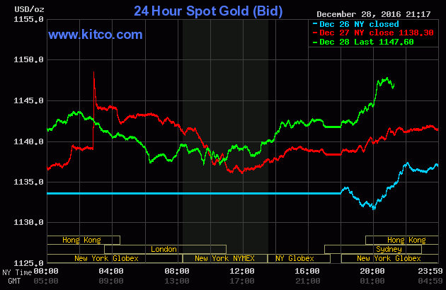 Chốt phiên giao dịch cuối Thứ Tư (ngày 28/12), giá vàng giao Tháng Hai trên sàn Comex tại Sở giao dịch New York Mercantile nhích nhẹ $2,00 (+0,2%) lên đóng cửa ở $1.141,00/oz – cao nhất kể từ 14/12. Tuy nhiên, thanh khoản trong phiên lại chỉ ở ức khá hạn chế.