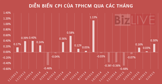 Cục Thống kê TP Hà Nội vừa công bố chỉ số giá tiêu dùng (CPI) tháng 5/2015. Theo đó, CPI TP Hà Nội tháng này tiếp tục tăng 0,12% , CPI TP.HCM cũng tăng 0,74% so với tháng trước.