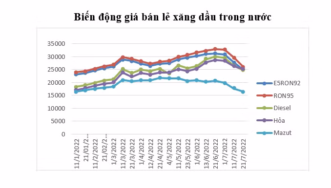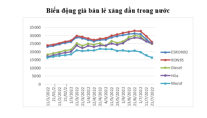 So với mức đỉnh hạ tuần tháng 6/2022, mỗi lít xăng RON 95 đã rẻ hơn 6.800 đồng; xăng E5 RON 92 giảm 6.230 đồng/lít; dầu diesel giảm 5.160 đồng/lít…