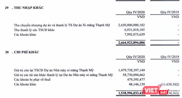 Ở chiều hướng ngược lại, công ty này ghi nhận tổng cộng 1.538,4 tỉ đồng chi phí khác, là giá trị còn lại của các tài sản cố định và các tài sản thanh lý khác liên quan tới Dự án xi măng Thạnh Mỹ. Tạm tính, Thaiholdings đã lãi hơn 1.111,6 tỉ đồng từ thương vụ này.