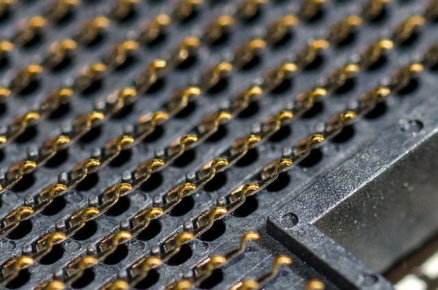 Dưới đây là ảnh chụp cận cảnh socket với các chân siêu nhỏ. Các chân này sẽ tiếp xúc trực tiếp với CPU, khung nẹp giữ chặt kết nối này và giúp máy tính có thể hoạt động. Số lượng các pin trong socket tùy thuộc vào CPU mà nó hỗ trợ, có thể kiểm tra dựa vào thông số kĩ thuật dưới dạng "Socket LGA xxxx", các CPU gần đây của Intel bao gồm thế hệ Sandy và Ivy có socket LGA 1155. Haswell có socket LGA 1150, và mới nhất Skylake sử dụng socket LGA 1151. Bạn cần đảm bảo dùng chính xác CPU lên các mainboard hỗ trợ nó, tránh các hỏng hóc đáng tiếc.