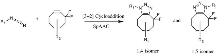 Mặc dù tiềm năng của CuAAC và các phản ứng click tương tự là rất lớn, chúng có một nhược điểm là chất xúc tác (chủ yếu là kim loại như đồng, rhutenium, niken, palladium…) có độc tính đối với tế bào nên không thể áp dụng vào cơ thể sống. Nhóm của Giáo sư Carolyn Bertozzi, khi đó đang công tác ở Đại học California, Berkeley (Hoa Kỳ), đã phát triển phản ứng click không sử dụng xúc tác đồng để khắc phục nhược điểm này của phản ứng CuAAC. Trong phản ứng của Bertozzi, thay vì dùng đồng để kích hoạt alkyne, họ biến đổi các alkyne sang dạng vòng được làm căng phồng (xem Hình 3). Sự căng phồng này làm giảm tính ổn định của alkyne và làm tăng khả năng phản ứng (để làm giảm sức căng trên các vòng). Phản ứng này vì thế có tên là Strain-promoted azide-alkyne cycloaddition (SpAAC).