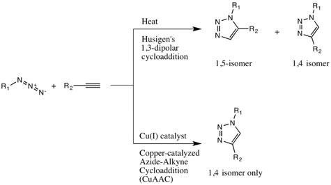 Phản ứng kinh điển trong Click chemistry là phản ứng có xúc tác đồng giữa hai phân tử: một phân tử có gắn nhóm cuối mạch là azide (R1-N=N+=N-) và phân tử còn lại có gắn nhóm cuối mạch là alkyne (R2 ―≡). Sản phẩm của phản ứng là hai phân tử nối với nhau thông qua cầu nối là nhóm triazole. Phản ứng tổng hợp triazole (không có xúc tác đồng) đã được nhà hóa học người Mỹ là Arthur Michael (1853-1942) báo cáo lần đầu tiên vào năm 1893. Sau đó, vào giữa thế kỷ 20, nhà hóa học người Đức là Rolf Huisgen (1920-2020) đã tiến hành nghiên cứu sâu hơn về động học và điều kiện của họ phản ứng đóng vòng 1,3 lưỡng cực này, và tên của ông đã được dùng để đặt cho chúng (phản ứng Huisgen).