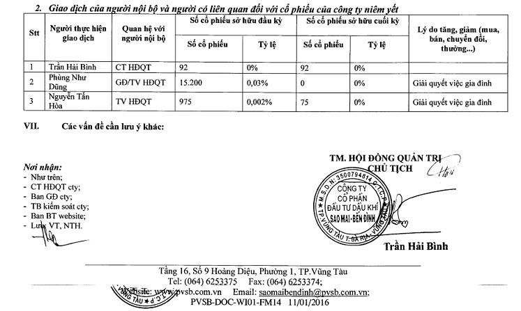 Báo cáo cũng cho biết một số thông tin liên quan đến tình hình sở hữu cổ phần công ty của một số lãnh đạo PVSB.