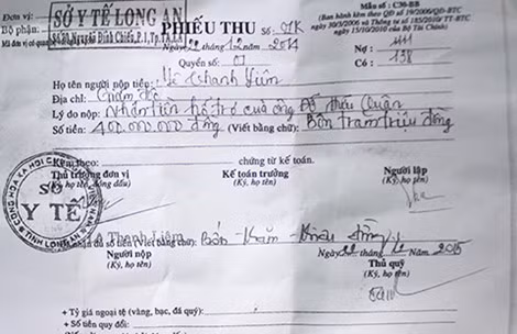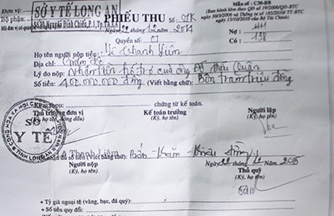 Cụ thể, trong phiếu thu này có chữ ký xác nhận của thủ quỹ, người lập biên bản và ông Liêm với số tiền 400 triệu đồng. Ở phần lý do nộp tiền có ghi rõ: “Nhận tiền hỗ trợ của ông ĐHQ”. Theo ông Liêm, số tiền 400 triệu đồng nói trên vẫn đang được lưu ở Sở Y tế và dự kiến được dùng làm kinh phí hoạt động cho Sở.
