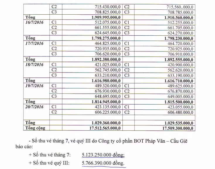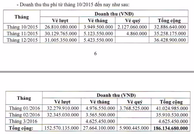 Trước đó, theo báo cáo số 276/BC-PVCG ngày 22/3/2016 của công ty BOT Pháp Vân- Cầu Giẽ về tình hình thực hiện dự án chuyển tới các cổ đông thì doanh thu trong 6 tháng (từ tháng 10/2015 đến tháng 3/2016) của công ty này là 186.134.680.000 đồng. Trong đó, số liệu tháng 3 chưa cập nhật doanh thu vé lượt.