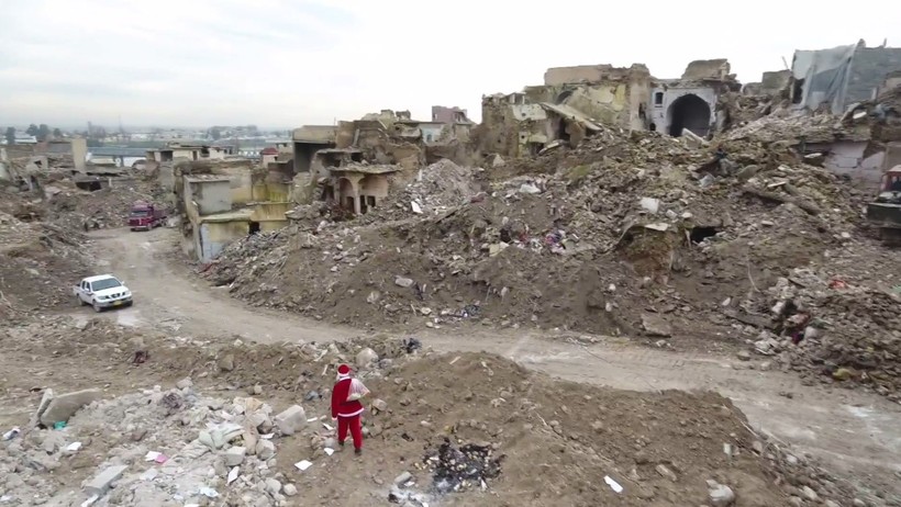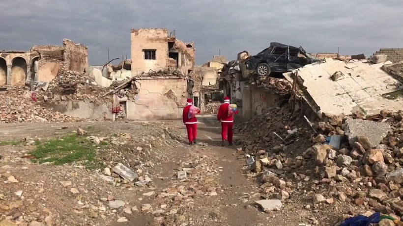 Hai người Iraq trong vai ông già Noel mang túi với những món quà nhỏ đầy màu sắc, đến thành phố cổ Mosul để trao những niềm vui nhỏ cho trẻ em địa phương, phải chịu vô vàn đau khổ trong thời kỳ Nhà nước Hồi giáo tự xưng (IS) áp đặt chế độ khủng bố hà khắc trong thành phố cách đây một năm rưỡi.