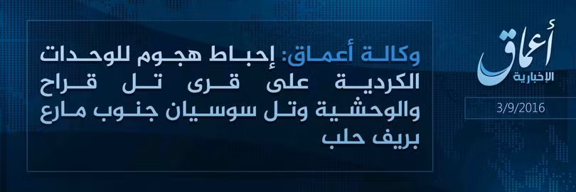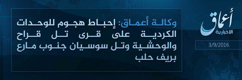 IS cho biết rằng những chiến binh khủng bố đã đẩy lùi một cuộc tấn công của lực lượng dân quân người Kurd “đơn vị bảo vệ đơn vị nhân dân” (YPG) ở Tell Farah, Wahshieh, Tell Sawsyan trên vùng nông thôn phía Bắc Aleppo.
