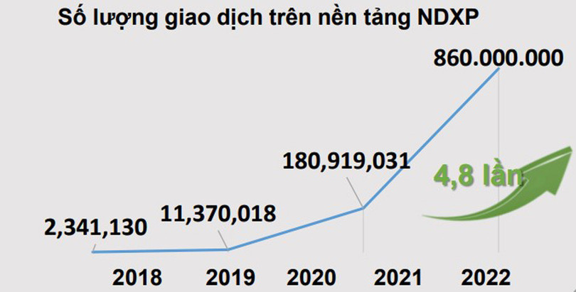 Số liệu mới nhất của Cục Chuyển đổi số quốc gia cho thấy, tính đến ngày 20/12/2022, tổng số giao dịch thực hiện thông qua nền tảng NDXP trong tháng 12/2022 đã đạt trên 120,4 triệu giao dịch 120.425.201 giao dịch. Trong năm 2022 đã có 860 triệu giao dịch được thực hiện, tăng gấp hơn 4,8 lần so với cả năm 2021. Trung bình mỗi ngày trong năm 2022 có khoảng 2,36 triệu giao dịch được thực hiện qua nền tảng NDXP.