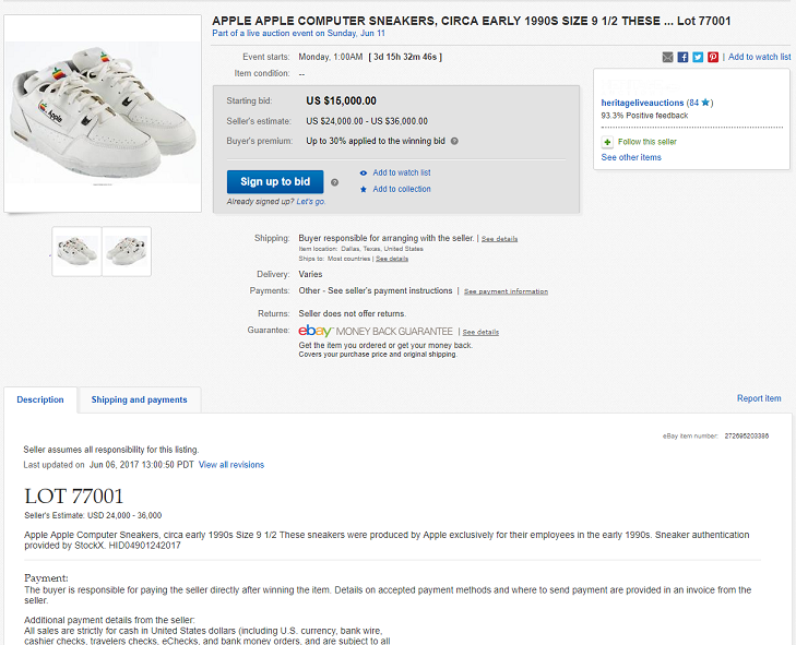 Theo The Next Web, một nhà sưu tầm đồ cổ mang tên Heritage Auctions đang chuẩn bị đấu giá một đôi giày sneaker của Apple với mức giá khởi điểm là 15 ngàn USD (gần 340 triệu đồng).