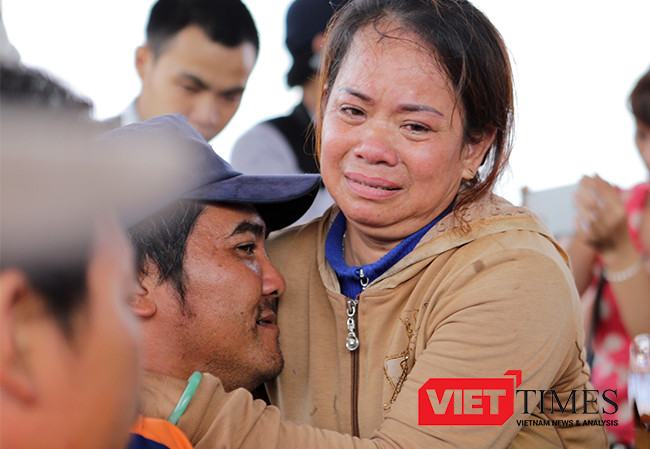 Thay chồng, bà Bùi Thị Luận (51 tuổi), vợ thuyền trưởng Phạm Phú Thành ôm từng thuyền viên tàu cá QNa 95959TS sau chuyến biển định mệnh