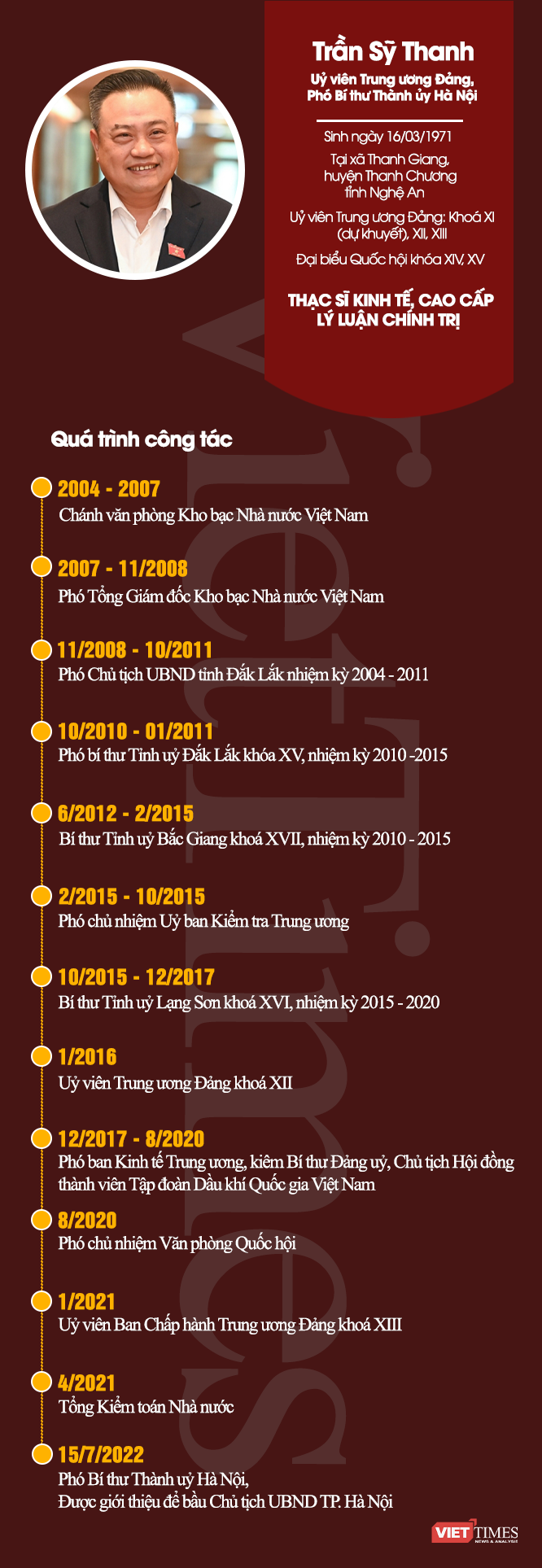 Là một chính trị gia dày dạn, ông Trần Sỹ Thanh có trải nghiệm công tác phong phú, được thử thách qua nhiều vị trí, ở cả trung ương và đại phương, ở cả khối chính quyền lẫn khối doanh nghiệp.