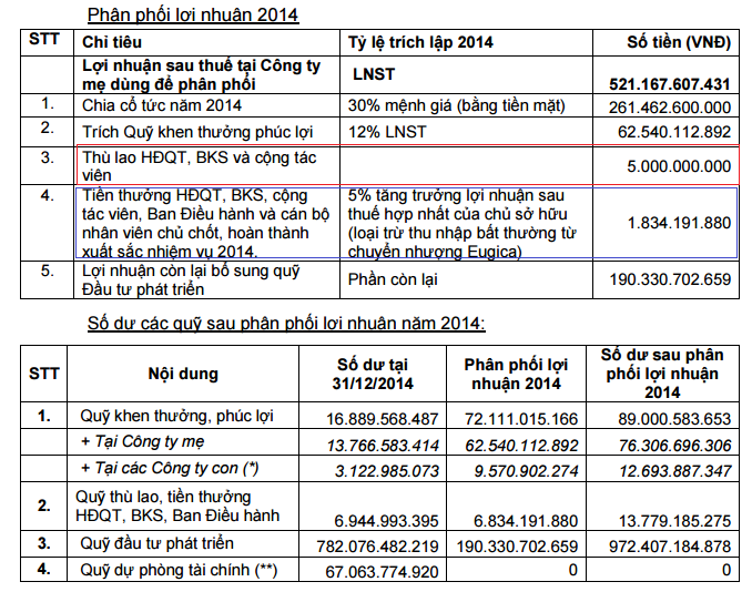 Ngoài ra, HĐQT, BKS, cộng tác viên, Ban Điều hành và cán bộ nhân viên chủ chốt, hoàn thành xuất sắc nhiệm vụ 2014 của DHG cũng được thưởng tổng cộng 1,834 tỷ đồng, tương ứng với 5% tăng trưởng lợi nhuận sau thuế hợp nhất của chủ sở hữu (loại trừ thu nhập bất thường từ chuyển nhượng Eugica).