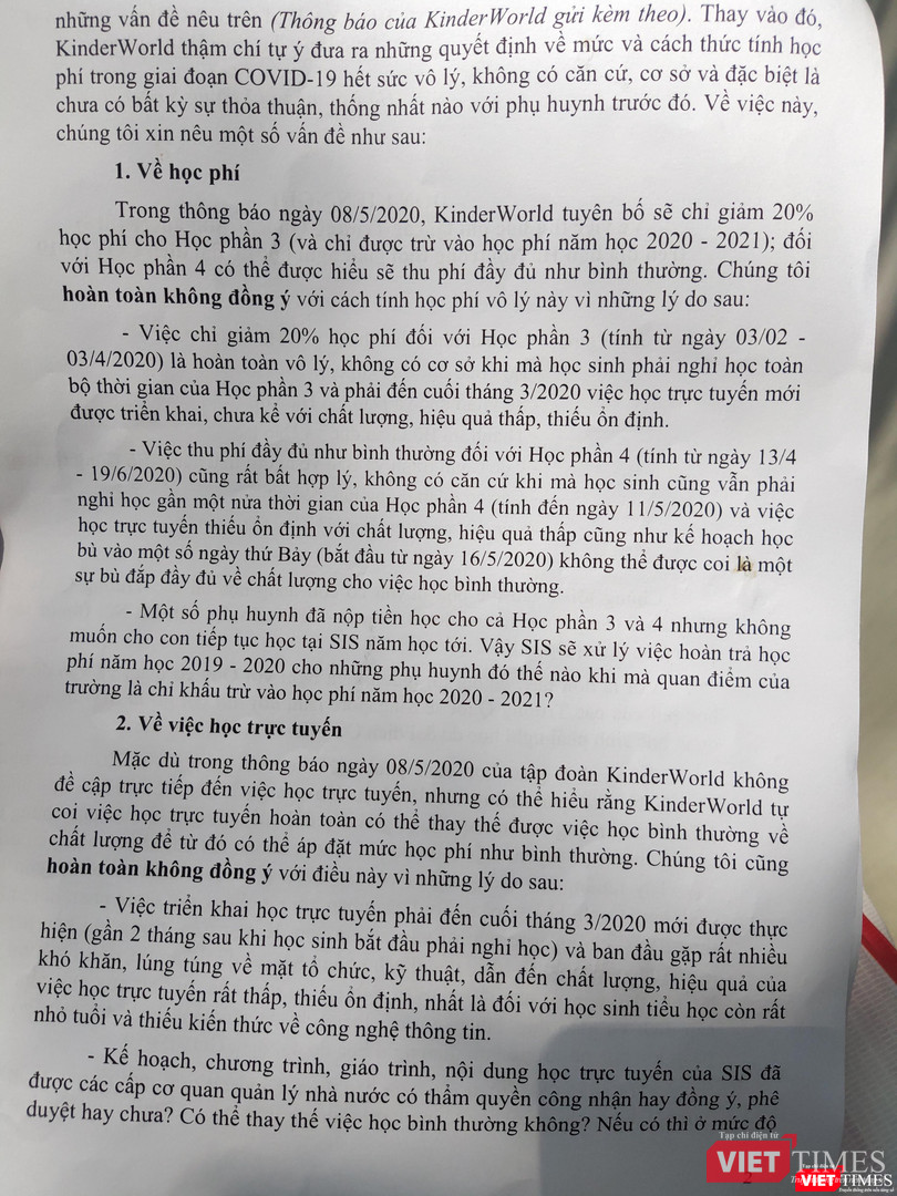 Theo yêu cầu của Bộ GD&ĐT, việc thu phí học trực tuyến chỉ có thể được thực hiện với sự thống nhất, đồng thuận cùng phụ huynh trước khi học trực tuyến. Tuy nhiên, Trường lại không có bất kỳ thông báo nào về kế hoạch, chương trình và học phí của việc học trực tuyến bằng văn bản chính thức trước khi tiến hành.