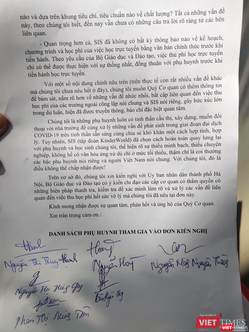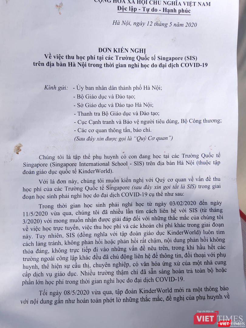 Quá bức xúc với cách cư xử của Trường Quốc tế Singapore, phụ huynh học sinh có con theo học tại Trường đã cùng nhau ký tên vào đơn kiến nghị gửi UBND TP. Hà Nội, Bộ GD&ĐT, Sở GD&ĐT, thanh tra Bộ GD&ĐT, Cục Cạnh tranh và Bảo vệ người tiêu dùng (Bộ Công thương) về việc thu học phí tại Trường Quốc tế Singapore trong thời gian nghỉ học do đại dịch COVID-19.