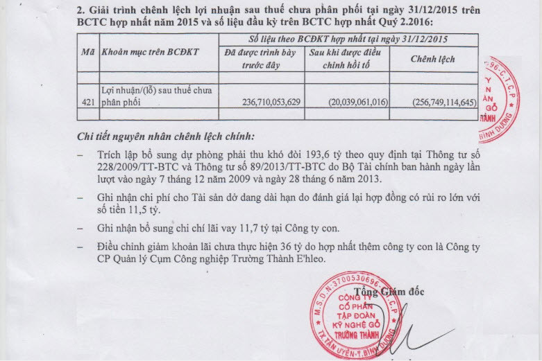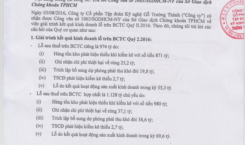 Theo đó, TTF giải trình về kết quả kinh doanh lỗ trên BCTC Quý 2.2016. Cụ thể, Công ty lỗ sau thuế trên BCTC riêng là 974 tỷ đồng do 5 lý do: Thứ nhất, hàng tồn kho phát hiện thiếu khi kiểm kê với tiền 871 tỷ đồng; Thứ hai, ghi nhận chi phí thiệt hại về rừng 25,2 tỷ; Thứ ba, trích lập bổ sung dự phòng phải thu khó đòi 19,8 tỷ; Thứ tư, TSCĐ phát hiện kiểm kê thiếu 2,7 tỷ đồng; Thứ năm, Lỗ do kết quả hoạt động sản xuất kinh doanh trong kỳ 55,3 tỷ.