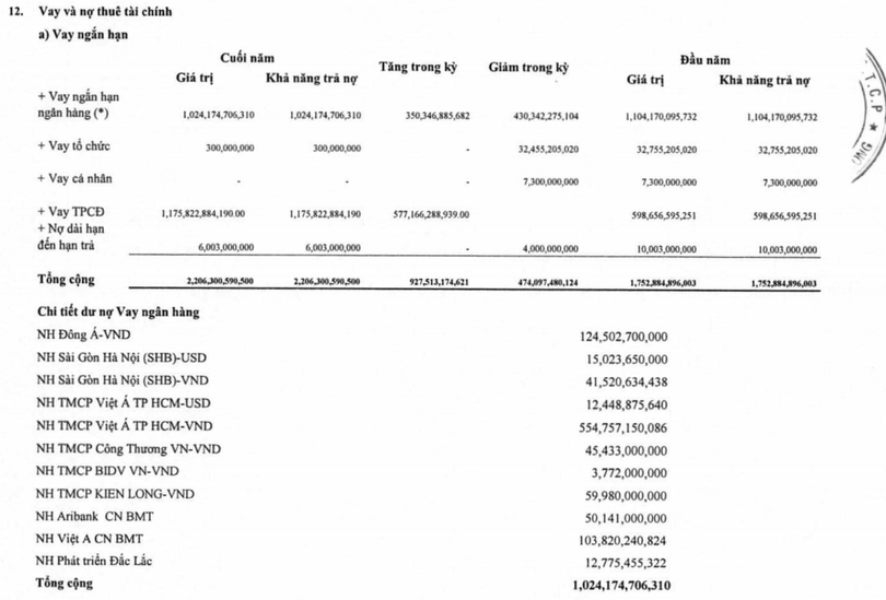Trong đó, DongA Bank cấp 124,5 tỷ đồng; SHB cấp 56,5 tỷ đồng; VietABank cấp 671 tỷ đồng; Vietinbank cấp 45,4 tỷ đồng; BIDV cấp 3,8 tỷ đồng; Kienlongbank cấp 60 tỷ đồng, Agribank cấp 50,1 tỷ đồng; VDB cấp 12,8 tỷ đồng.