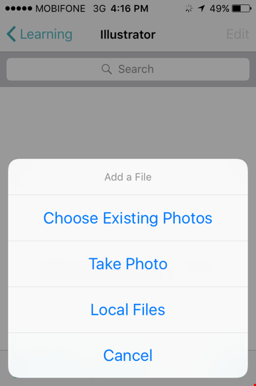 Các thao tác trên Otixo tương đối đơn giản, đầu tiên bạn chỉ cần tạo một thư mục mới, upload dữ liệu lên thông qua tùy chọn Add a file. Tại đây, có ba lựa chọn để upload dữ liệu lên tài khoản gồm Choose existing photos (chọn hình ảnh trên thiết bị để upload), take photo (dùng camera chụp ảnh và upload), local files (chọn tập tin trên thiết bị).