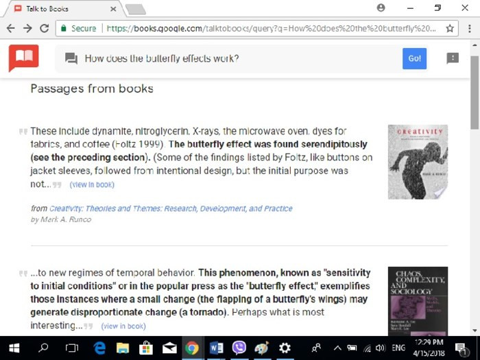 Theo Engadget, bộ phận Nghiên cứu của Google (Google Research) mới đây đã tung ra một 2 sản phẩm thử nghiệm với tên gọi Sematic Experiences (Trải nghiệm Ngữ nghĩa), bao gồm 2 trang web thú vị để chứng minh với mọi người về khả năng của trí tuệ nhân tạo (AI) có thể hiểu rõ ràng những gì chúng ta nói. Một trong 2 trang web có tên gọi "Talk to Books"(tạm dịch: Hãy nói với Sách), nơi mà người dùng có thể sử dụng trang này để "giao tiếp" với sách, và có thể hiểu người dùng hỏi ở giới hạn những ngành nhất định. Bạn chỉ cần viết một câu nói hay một câu hỏi bất kì, và ứng dụng sẽ tìm tất cả những câu liên quan nhất để đáp lại với những gì bạn vừa nhập ở nhiều những đầu sách. Bạn đọc có thể thử nghiệm tính năng Talk to Books qua link website này.