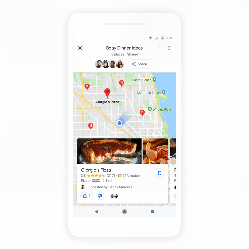 Google cũng đang phát triển nhiều tính năng tương tác xã hội vào Maps, cho phép một nhóm chia sẻ nhiều địa điểm khác nhau và cùng biểu quyết mà không cần phải rời khỏi ứng dụng. Tính năng tương tác xã hội và đề xuất địa điểm trên Maps được biết sẽ cập bến Android và iOS vào hè năm nay.