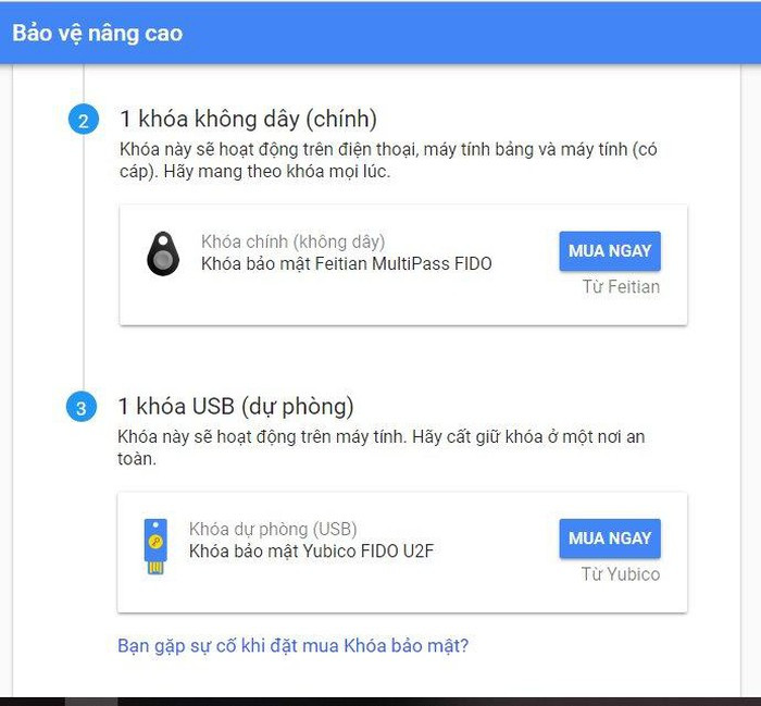 Hiện tại trên trang chủ của mình, Google đã chính thức cho đăng kí mua gói "bảo vệ nâng cao", bao gồm "1 khóa không dây (chính)" từ Feitian - Khóa này sẽ hoạt động trên điện thoại, máy tính bảng và máy tính (có cáp). Hãy mang theo khóa mọi lúc.