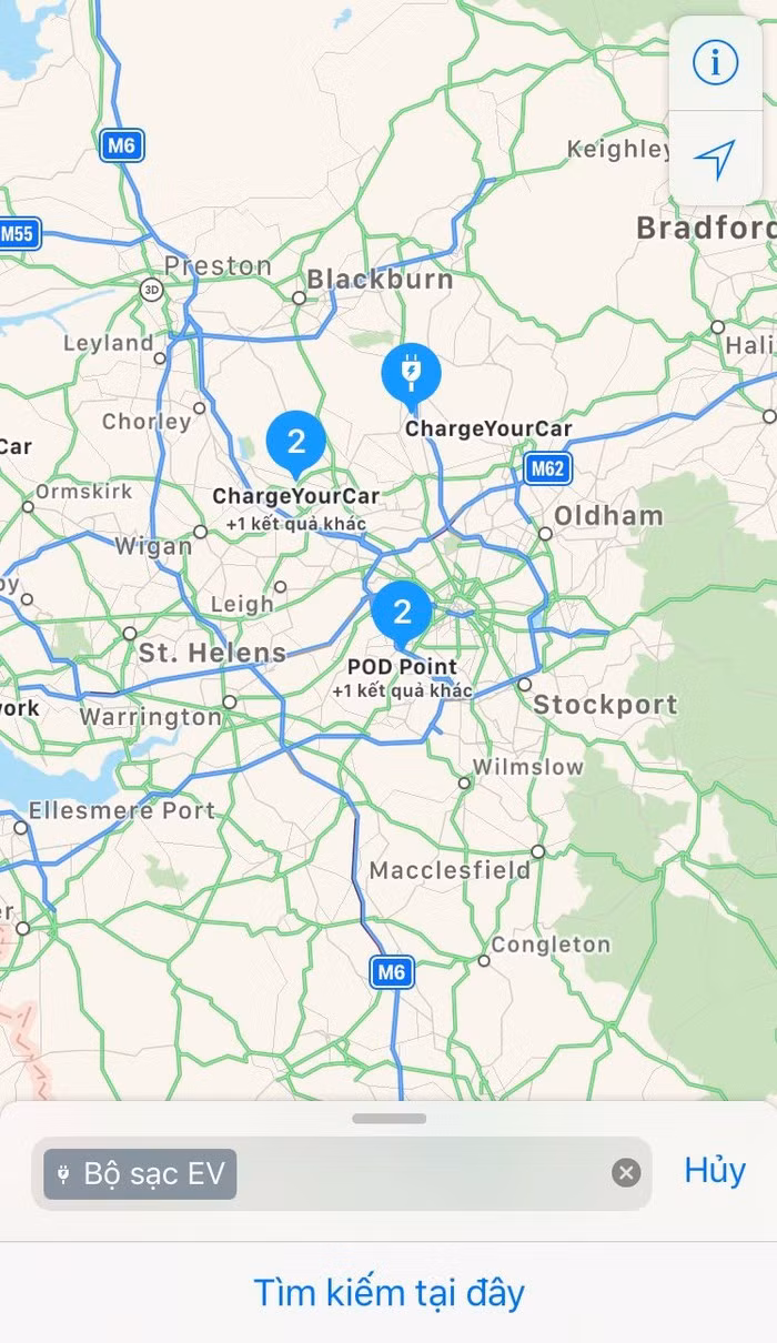 Bây giờ bạn chỉ cần ấn vào tiện ích "Tìm kiếm" bằng những từ khóa như "Bộ sạc EV" hoặc "Trạm sạc EV", bản đồ sẽ hiển thị tất cả trạm sạc cũng như thông tin chi tiết về các loại sạc, cổng sạc, hãng sạc EV phù hợp với thiết bị trong khu vực gần người dùng nhất. Ví dụ như thế này: