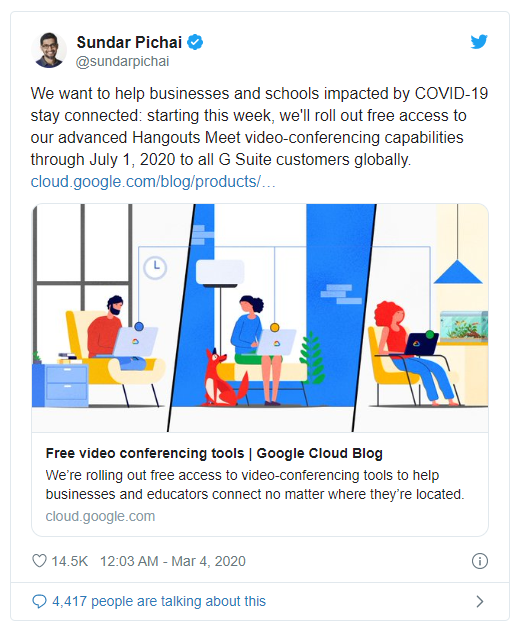 Trong một bài blog mới đăng tải gần đây, Google cho biết "Trong bối cảnh ngày càng nhiều người lao động, giảng viên và sinh viên làm việc và học tập tại nhà khi dịch bệnh Covid-19 đang lây lan rộng, chúng tôi muốn góp một phần của mình để giúp họ luôn kết nối và làm việc có hiệu quả."