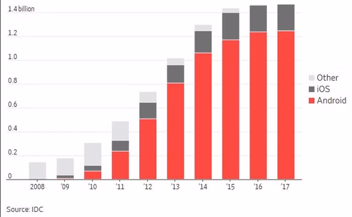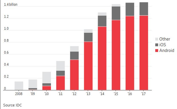 Lượng thiết bị smartphone bán ra tính theo hệ điều hành sử dụng. Nguồn: IDC