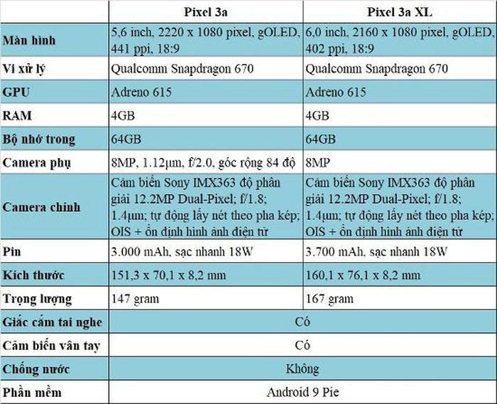Bảng so sánh thông số kỹ thuật chính giữa Google Pixel 3a và Pixel 3a XL