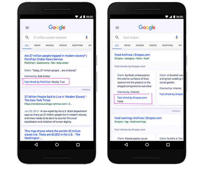 Hình dưới đây cho thấy khi người dùng tìm kiếm lời phát ngôn “27 triệu người bị đối xử như nô lệ”, Google trả về kết quả bao gồm bài viết, Thượng nghị sỹ Bob Corker là người đã đưa ra phát ngôn này, đồng thời gắn thẻ “Xác minh chân thực” với xác nhận của PolitiFact “hầu hết là đúng”.