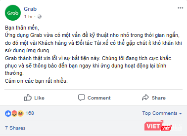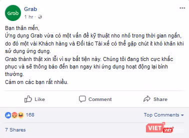 Vào lúc 21h ngày 3/4, dịch vụ gọi xe phổ biến nhất tại Đông Nam Á Grab đã thông báo trên Facebook rằng "công ty là đang gặp vấn đề kỹ thuật và sẽ gián đoạn trong một khoảng thời gian ngắn".