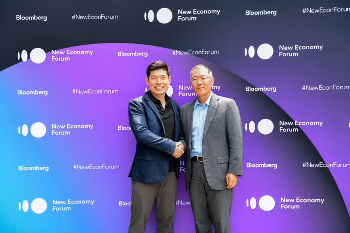 CEO Anthony Tan của Grab (trái) và Euisun Chung - Phó chủ tịch điều hành của Hyundai Motor Group (phải) bắt tay thỏa thuận, đánh dấu khoản đầu tư trị giá 250 triệu USD mới nhất.