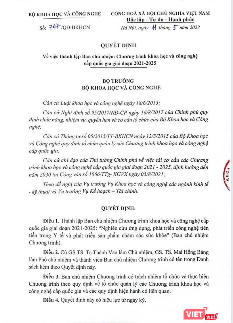 Ban Chủ nhiệm Chương trình KH&CN cấp quốc gia giai đoạn 2021-2025: “Nghiên cứu ứng dụng, phát triển công nghệ tiên tiến trong Y tế và phát triển sản phẩm chăm sóc sức khỏe” gồm 5 thành viên. GS.TS. Tạ Thành Văn được cử làm Chủ nhiệm Chương trình và GS. TS. Mai Hồng Bàng – Giám đốc Bệnh viện Trung ương Quân đội 108 - làm Phó Chủ nhiệm.