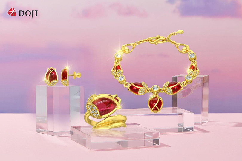 BST “Nữ Hoàng Mùa Xuân” của DOJI đã khắc hoạ nét đẹp độc đáo ấy trên chất liệu Vàng 24K kết hợp với đá màu mang sắc đỏ nổi bật, tượng trưng cho yêu thương bất diệt và nồng cháy mà bạn muốn trao gửi đến một nửa thế giới.