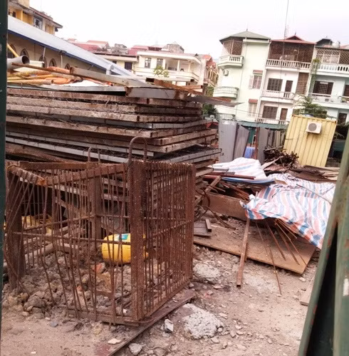 Công trường không một bóng người, sắt thép hoen gỉ chất ngổn ngang phía dưới
