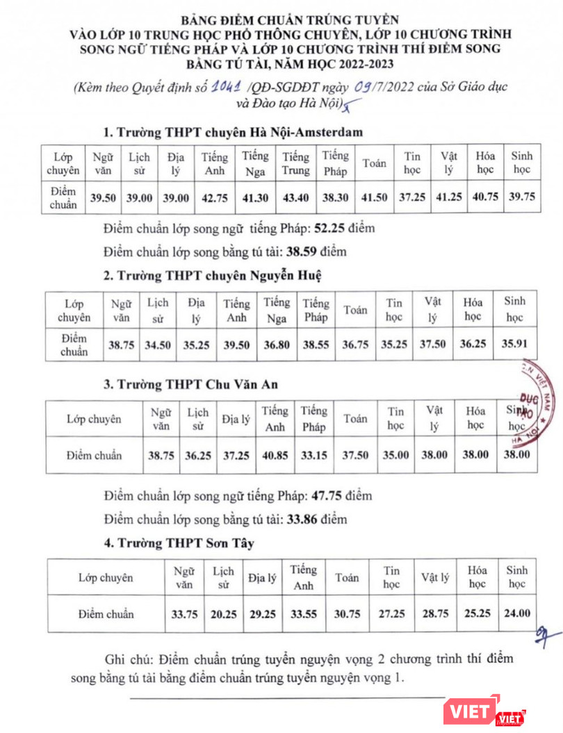 Trưa nay (9/7), Sở Giáo dục và Đào tạo Hà Nội vừa công bố điểm chuẩn vào các trường THPT chuyên và lớp 10 chương trình song ngữ tiếng Pháp và lớp 10 chương trình thí điểm song bằng tú tài năm học 2022- 2023 trên địa bàn, gồm: Trường THPT chuyên Hà Nội - Amsterdam, Trường THPT chuyên Nguyễn Huệ, Trường THPT Chu Văn An và Trường THPT Sơn Tây.