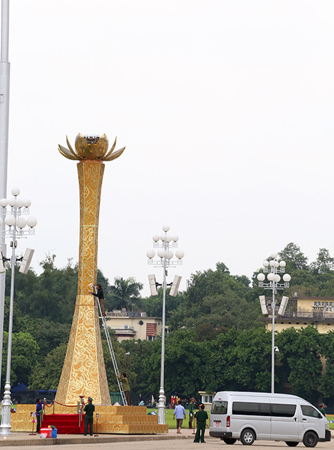 Đài sen cao hơn 10m, trước cửa Lăng Chủ tịch Hồ Chí Minh cũng đang được các đơn vị tất bật hoàn thiện, chuẩn bị cho lễ diễu binh mừng Quốc khánh.
