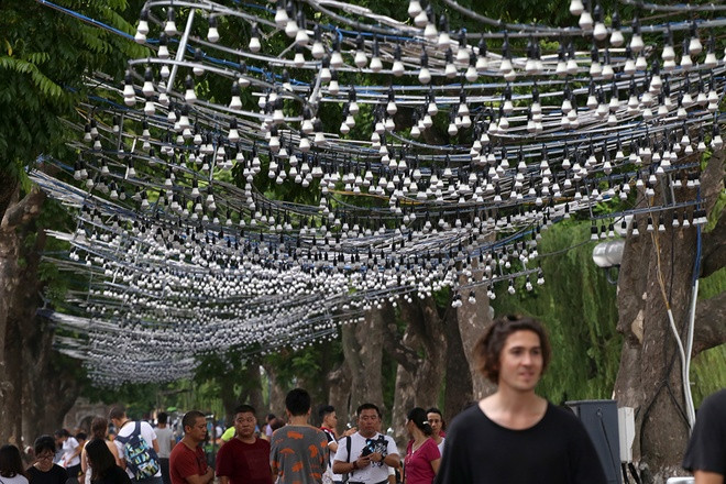 Trao đổi với VnExpress, ông Nguyễn Thành Chung, phụ trách kỹ thuật của công ty cho biết, hệ thống đèn đèn trí nghệ thuật quanh khu vực hồ Hoàn Kiếm được thiết kế và phê duyệt cách đây nhiều tháng. 60 công nhân được huy động làm việc 2 ca, cả ngày lẫn đêm ròng rã trong vòng hơn một tháng mới có thể hoàn thiện công trình đúng dịp đại lễ.