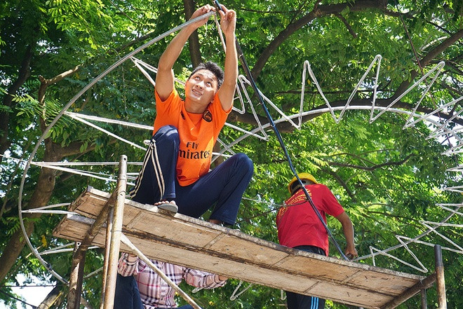 Trên khu vực quanh bờ hồ Hoàn Kiếm, hàng chục công nhân, nhân viên của Công ty thương mại, dịch vụ Tăng Văn Long (TP. Hồ Chí Minh) đang lắp đặt và hoàn thiện, trang trí hệ thống đèn led. Toàn bộ số đèn nghệ thuật, thiết kế, gia công khung tại Sài Gòn.
