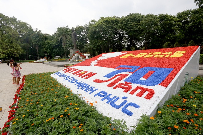 Xung quanh hồ Gươm, công viên Lê Nin... công nhân Công ty cây xanh đã hoàn tất việc trồng và ghép những bông hoa thành hình chữ kỷ niệm 70 năm Quốc khánh.