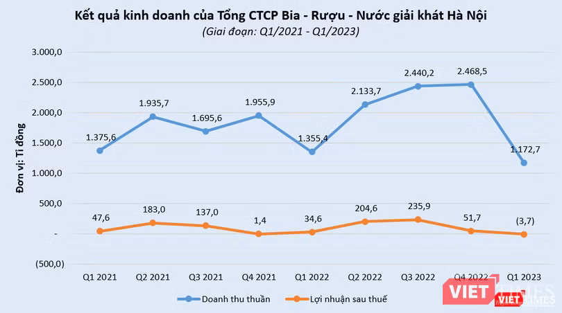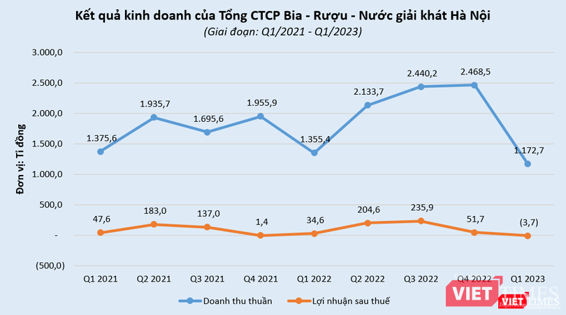 Trừ đi các chi phí khác và thuế, Habeco báo lỗ ròng 3,7 tỉ đồng trong quý 1/2023, trong khi cùng kỳ năm trước có lãi 34,5 tỉ đồng. Đây cũng là lần đầu tiên Habeco báo lỗ sau 12 quý liên tiếp kể từ quý 2/2020.