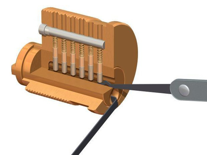 Trong quá trình tra chìa vào ổ, chìa khóa sẽ tạo ra tiếng lách cách bất cứ khi nào nó đi qua một lẫy khóa, nếu hoàn thành đủ 6 lẫy, chìa có thể xoay ra để mở ổ.