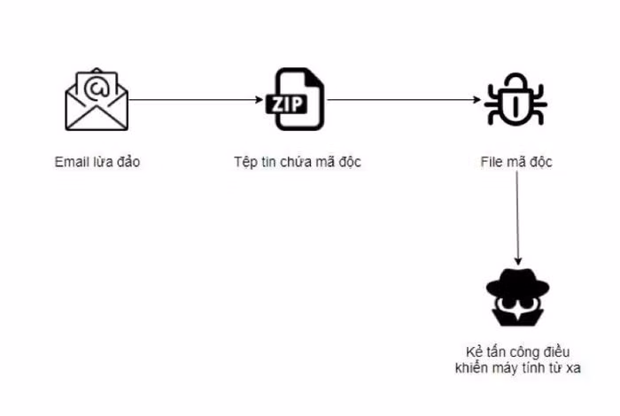 Khi người dùng thực hiện tải, giải nén và mở tệp tin có chứa mã độc, mã độc sẽ được thực thi lây nhiễm trên máy nạn nhân.