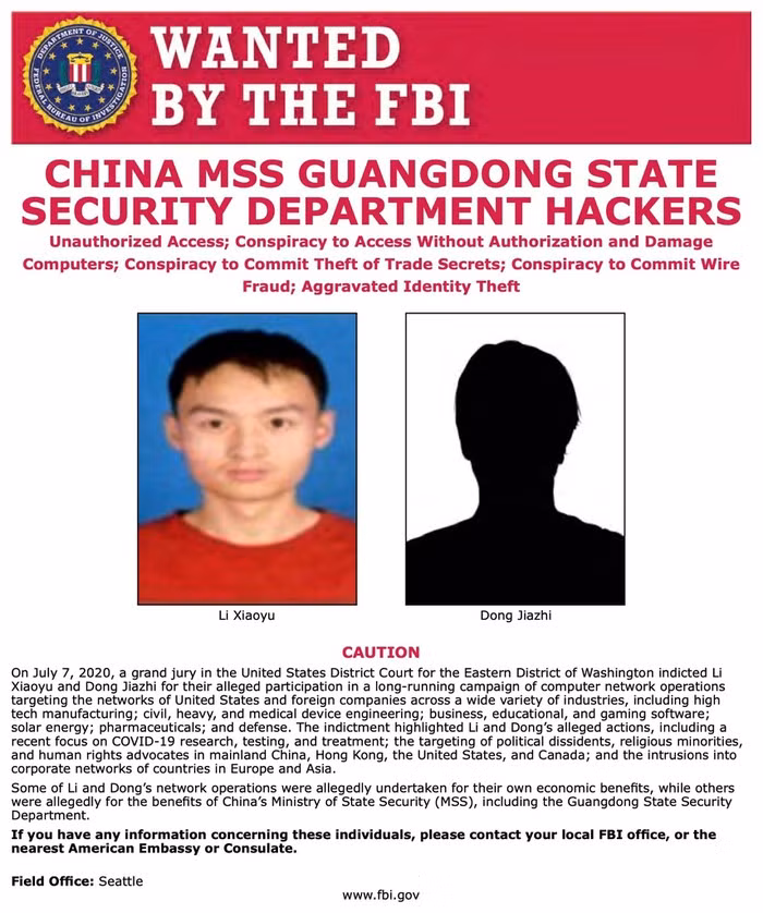 Cơ quan này cho hay 2 hacker đã lấy cắp nghiên cứu về công nghệ sóng radio và laser của một công ty quốc phòng tại California, cũng như các bản vẽ kỹ thuật tua-bin khí của một công ty có trụ sở tại Mỹ và Nhật.